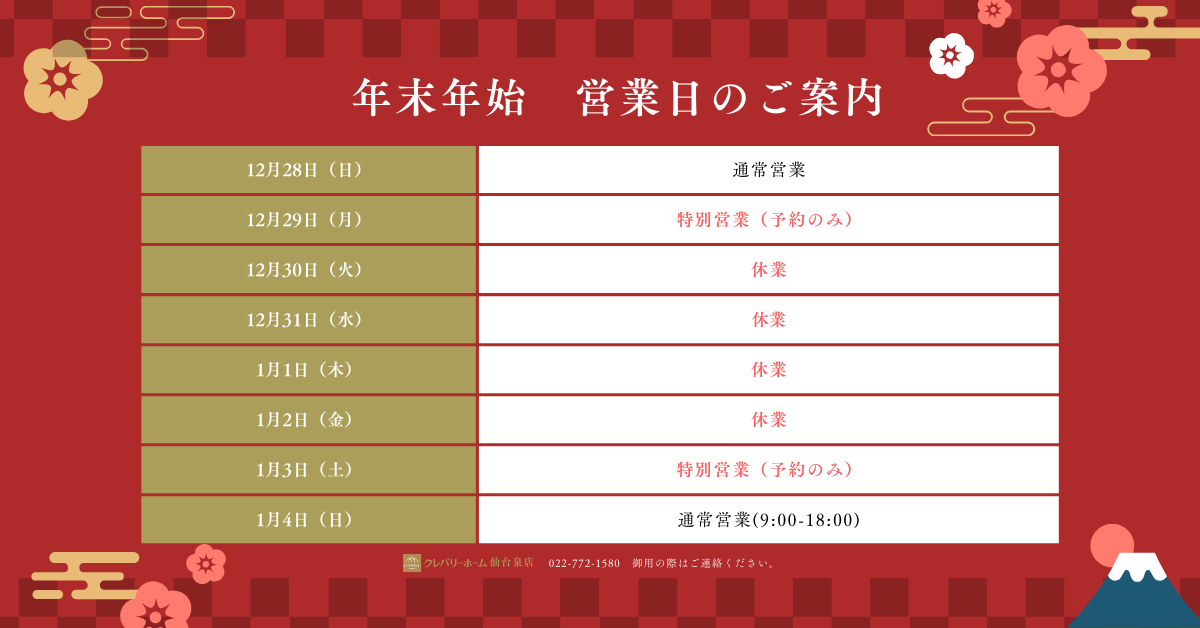 - 【2025年 年末年始のご案内】クレバリーホーム仙台泉店